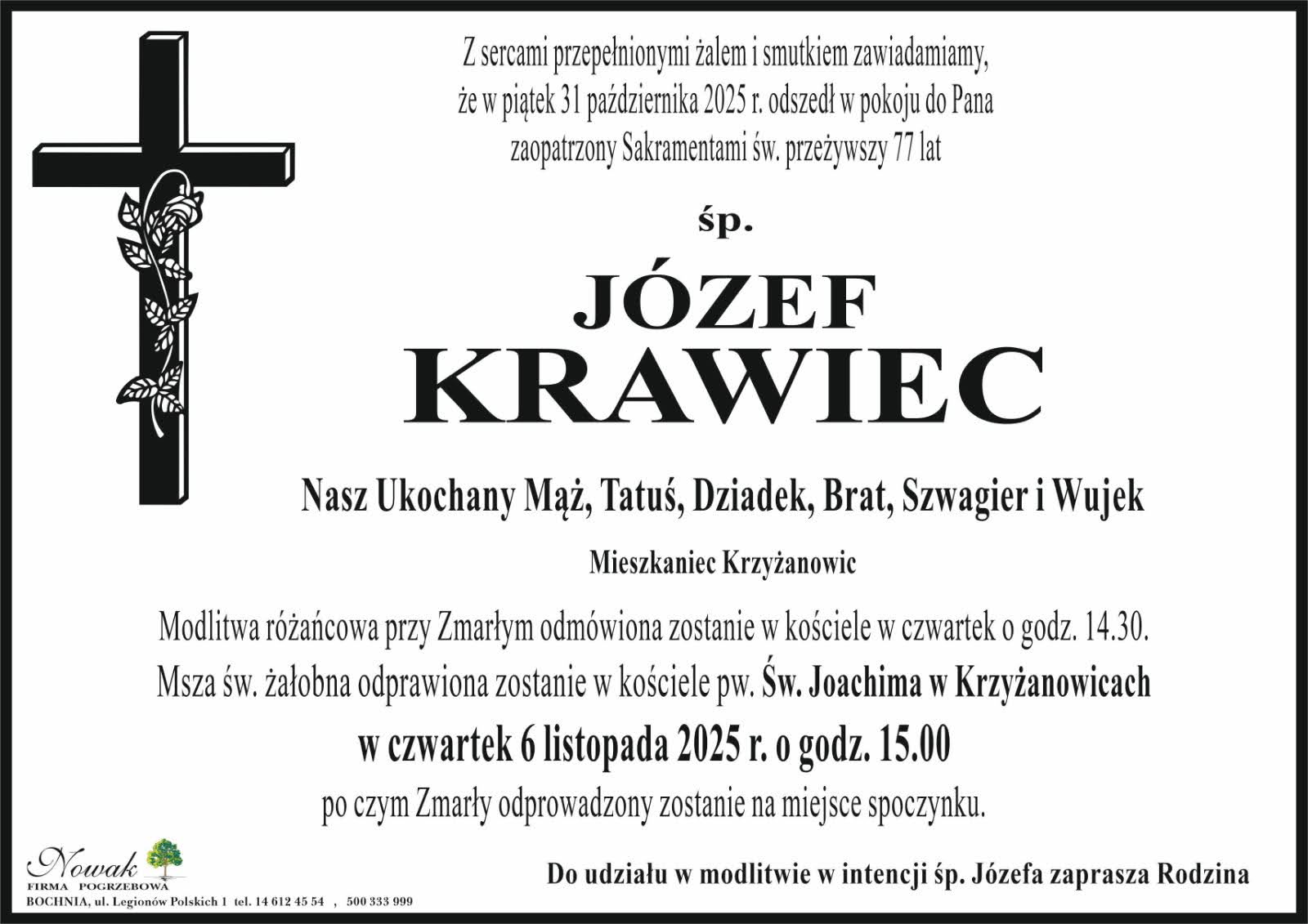 Pogrzeb w czwartek 06.11.2025r. o godzinie 15:00, pół godziny wcześniej o godzinie 14:30 Różaniec w int. Zmarłego